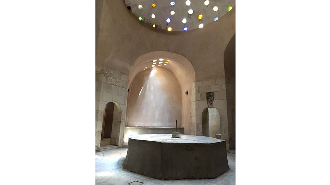 يتكون من مدخل بسيط يؤدي إلى ممر منكسر ينتهي إلى الحجرة الباردة حيث يتم خلع الملابس للاستعداد للاستحمام، ويتواجد بها مقاعد للجلوس وخزانات لحفظ المتعلقات الشخصية للمستحم، وتؤدي تلك الحجرة إلى ممر أخر يصل إلى الحجرة الدافئة وينتقل منها إلى الحجرة الساخنة، وعند الخروج يتم المرور بتلك الوحدات بطريقة عكسية بحيث تتم تهيئة درجة حرارة الجسم للخروج للهواء، وقد استخدمت بكل من الحجرة الباردة والساخنة القباب الضحلة للمحافظة على دورة الهواء الساخن، كما تم تزويد القباب بفتحات مغطاه بالزجاج الملون لإضاءة المكان.