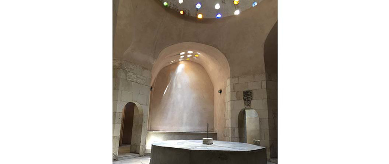 يتكون من مدخل بسيط يؤدي إلى ممر منكسر ينتهي إلى الحجرة الباردة حيث يتم خلع الملابس للاستعداد للاستحمام، ويتواجد بها مقاعد للجلوس وخزانات لحفظ المتعلقات الشخصية للمستحم، وتؤدي تلك الحجرة إلى ممر أخر يصل إلى الحجرة الدافئة وينتقل منها إلى الحجرة الساخنة، وعند الخروج يتم المرور بتلك الوحدات بطريقة عكسية بحيث تتم تهيئة درجة حرارة الجسم للخروج للهواء، وقد استخدمت بكل من الحجرة الباردة والساخنة القباب الضحلة للمحافظة على دورة الهواء الساخن، كما تم تزويد القباب بفتحات مغطاه بالزجاج الملون لإضاءة المكان.